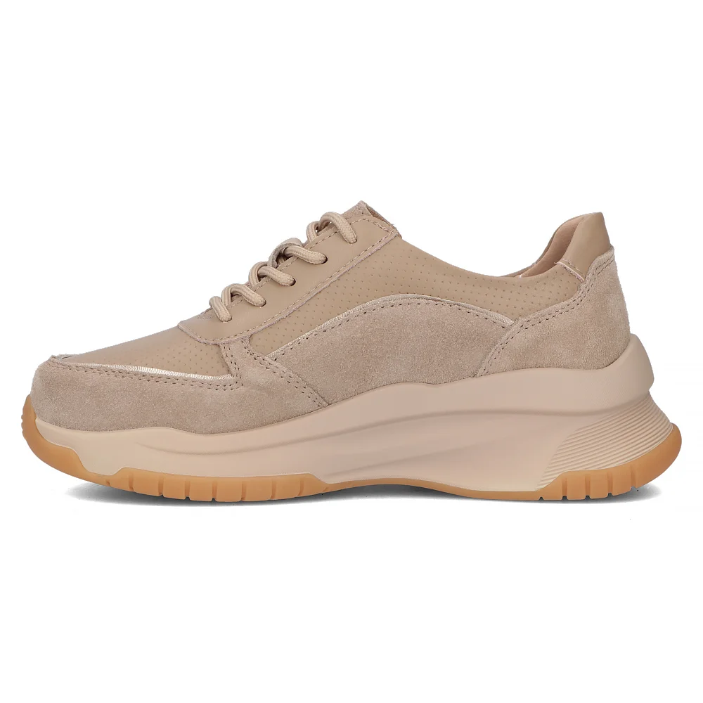 Beżowe buty sportowe z zamszowymi wstawkami i solidną gumową podeszwą zapewniają komfort i styl na co dzień. Dodatkowy zamek błyskawiczny po boku ułatwia zakładanie i zdejmowanie.